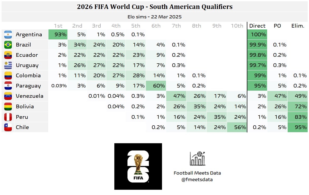 03月22日訊 2026世界杯預選賽南美區已進行到第13輪,數據機構Football Meets Data給出了各隊最新的晉級概率。