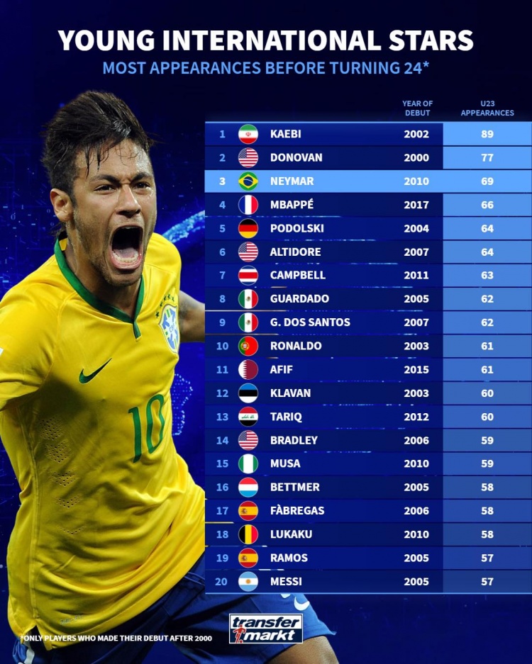 3月23日訊 德國轉(zhuǎn)會(huì)市場(chǎng)統(tǒng)計(jì)球員24歲之前在國家隊(duì)的出場(chǎng)次數(shù),并列出榜單,內(nèi)馬爾69場(chǎng)排名第三位,C羅61場(chǎng),梅西57場(chǎng)。