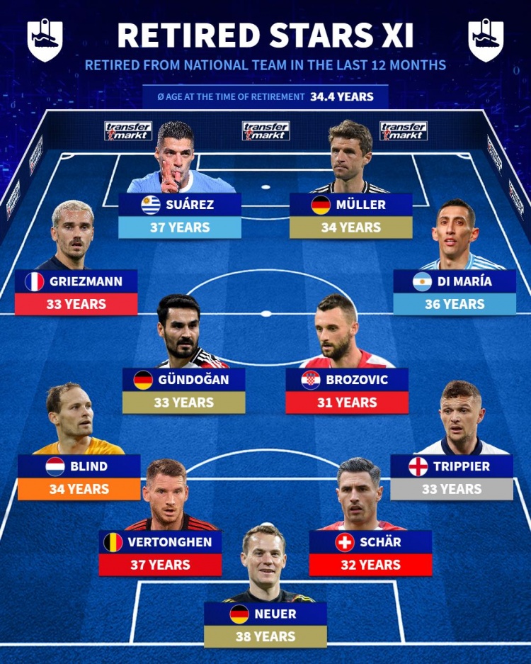 3月23日訊 德國轉(zhuǎn)會(huì)市場(chǎng)列出了近一年從國家隊(duì)退役的球星陣容,蘇亞雷斯、穆勒、格列茲曼、迪馬利亞、諾伊爾在列。