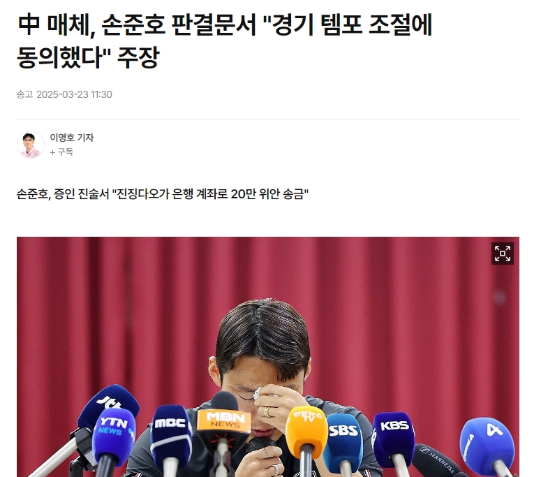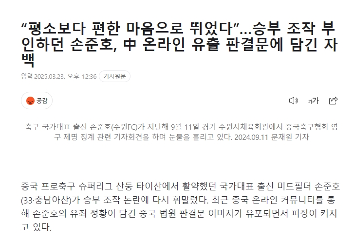 韓媒標題:“我比平時更放松心態比賽”孫準浩否認操縱比賽,但在中國網絡上泄露的判決書中承認了這一罪行。