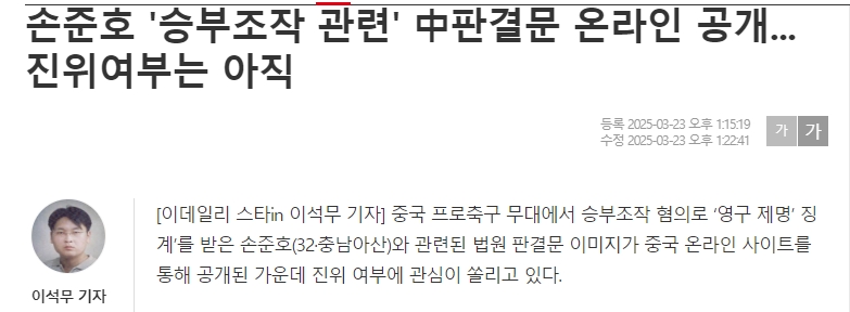edaily標題:孫準浩假球案判決書在網上發布,真實性尚不清楚。