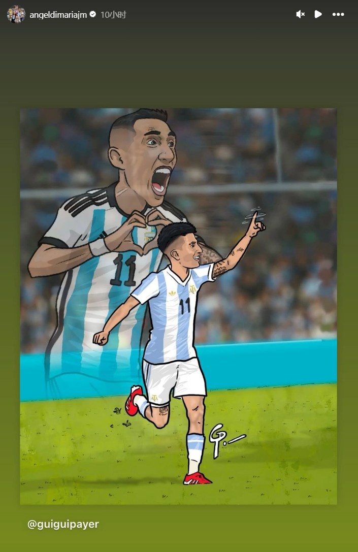 他的表現得到了前輩的認可,迪馬利亞轉發了一張兩人同框的漫畫海報,預示著阿根廷11號的傳承。