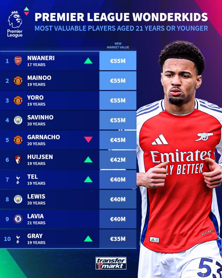 3月19日訊 德國(guó)轉(zhuǎn)會(huì)市場(chǎng)更新了英超U21球員的最新身價(jià),并列出身價(jià)榜單,恩瓦內(nèi)里、梅努、約羅、薩維尼奧5500萬(wàn)歐并列居首。
