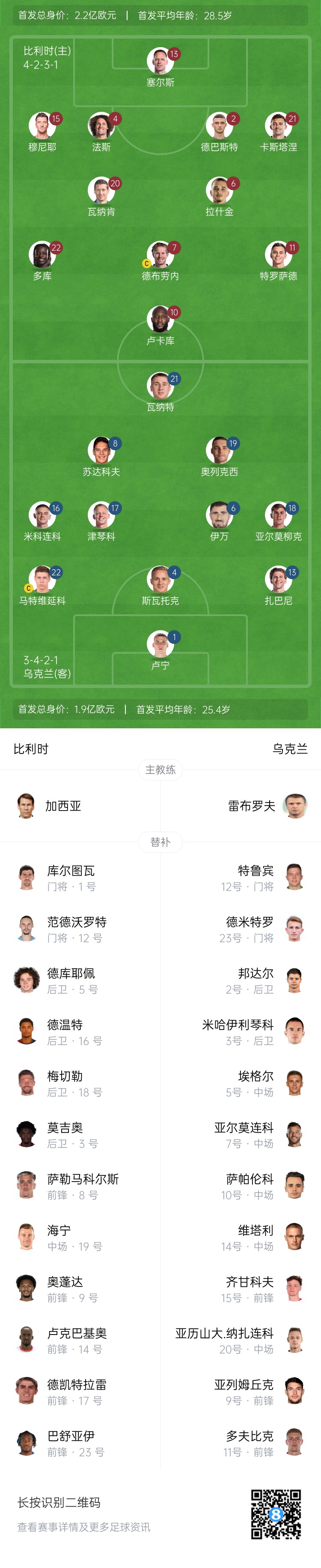 比利時(shí)首發(fā):13-塞爾斯、15-穆尼耶、4-法斯、2-德巴斯特、21-卡斯塔涅、20-瓦納肯、6-拉什金、7-德布勞內(nèi)、11-特羅薩德、22-多庫(kù)、10-盧卡庫(kù)