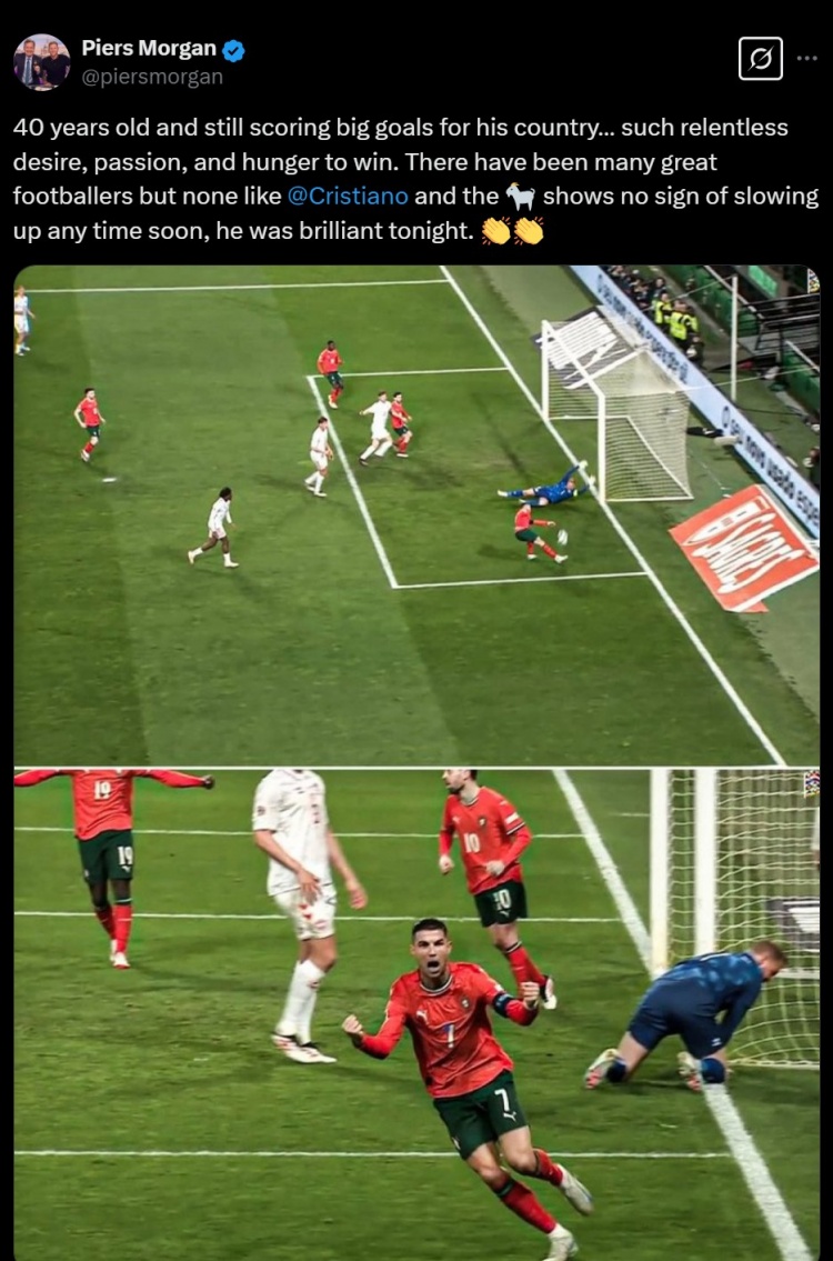 摩根寫道:40歲了,依然能為國家隊取得關鍵進球……他彰顯了如此不懈的渴望、激情和對勝利的饑餓感。偉大的球員有很多,但沒有一個能像C羅一樣。并且,GOAT(歷史最佳球員)沒有任何跡象表明他會很快放慢腳步,他今晚表現得非常出色。????