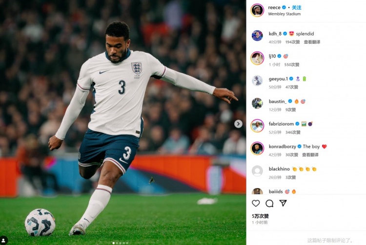 同場打進英格蘭隊處子球!里斯-詹姆斯&埃澤社媒曬照紀念?