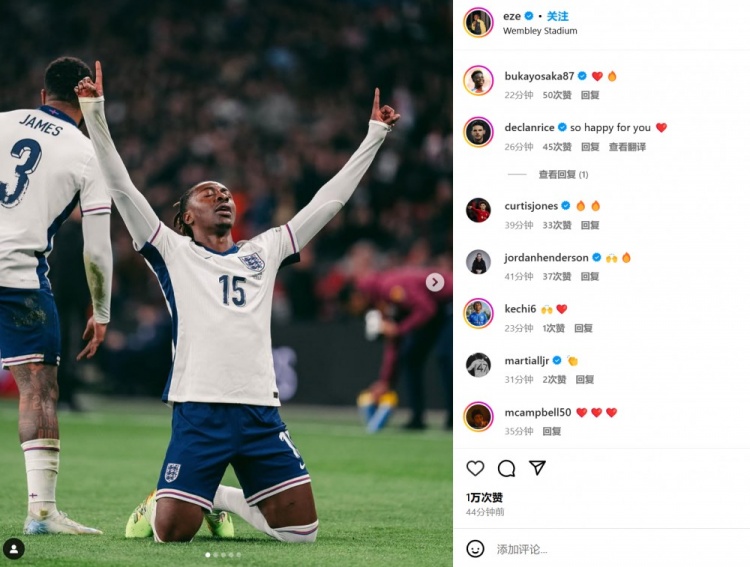 兩人也都在賽后通過社媒曬出自己的比賽照,但并未附加文字內容。賴斯和霍爾等隊友紛紛送上鼓勵:“為你感到高興”、“棒極了”…