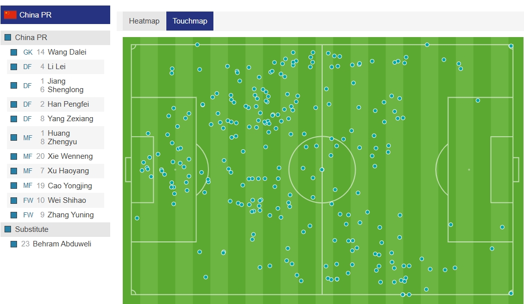 03月25日訊 世預賽亞洲區第三階段C組第8輪,中國vs澳大利亞。比賽上半場國足在主場陷入全面被動,根據觸球統計圖顯示,國足半場只在澳大利亞禁區內觸球3次,熱區圖顯示國足很難壓過半場。