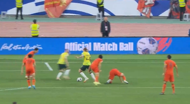 03月25日訊 國足vs澳大利亞第16分鐘,國足單后腰黃政宇失誤,歐文打破僵局。