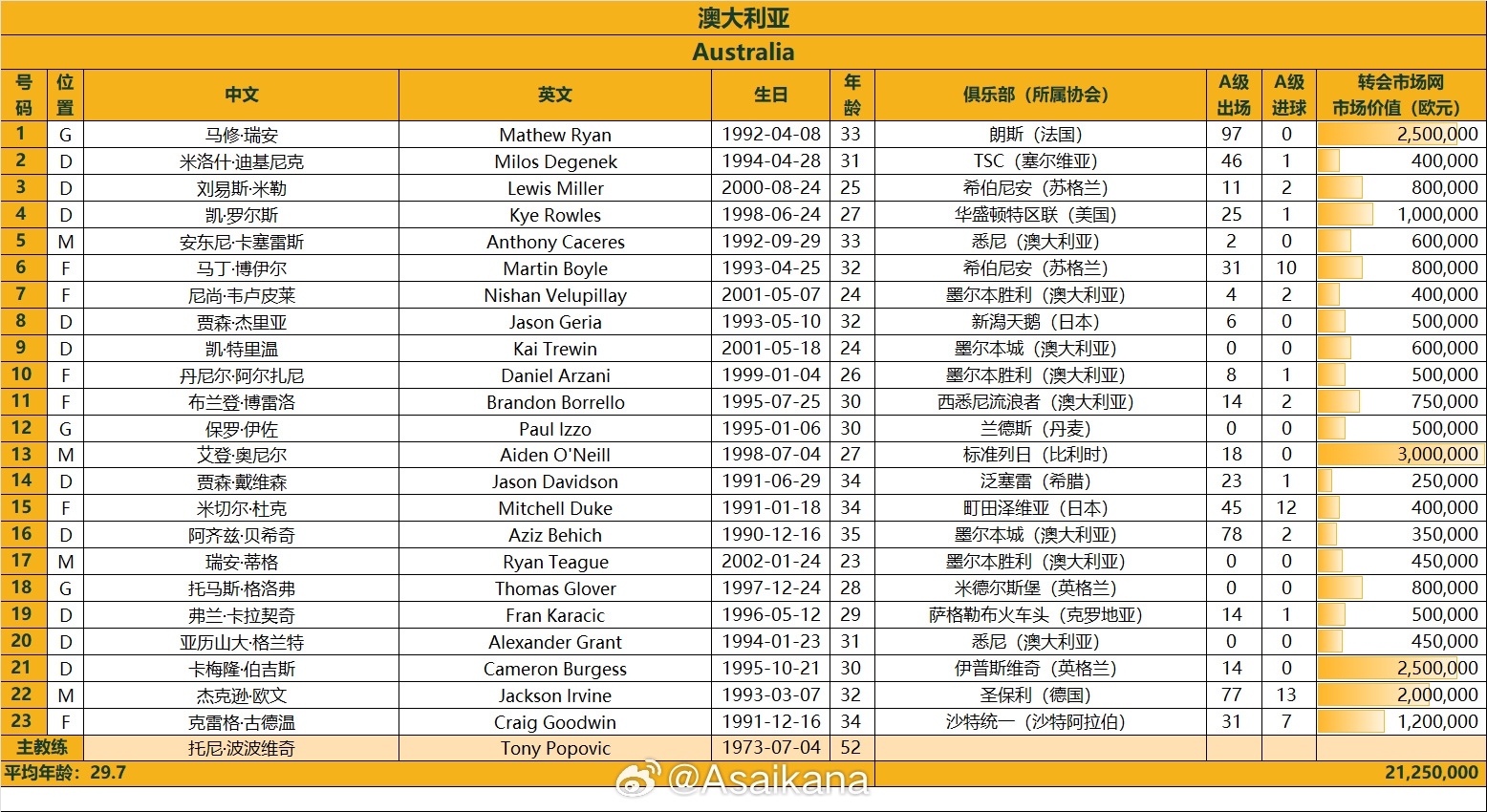 總身價:中國1145萬歐元,澳大利亞2125萬歐元。