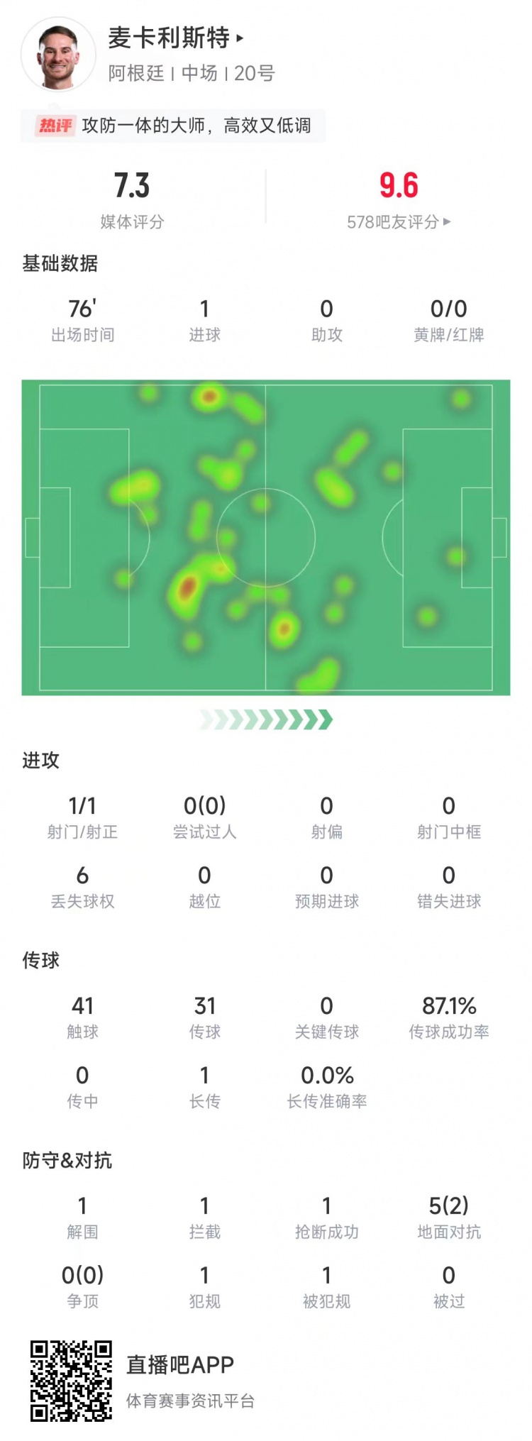 麥卡利斯特本場數據:射門1次打進1球,傳球成功率87.1%&評分7.3?