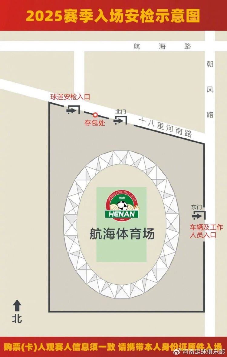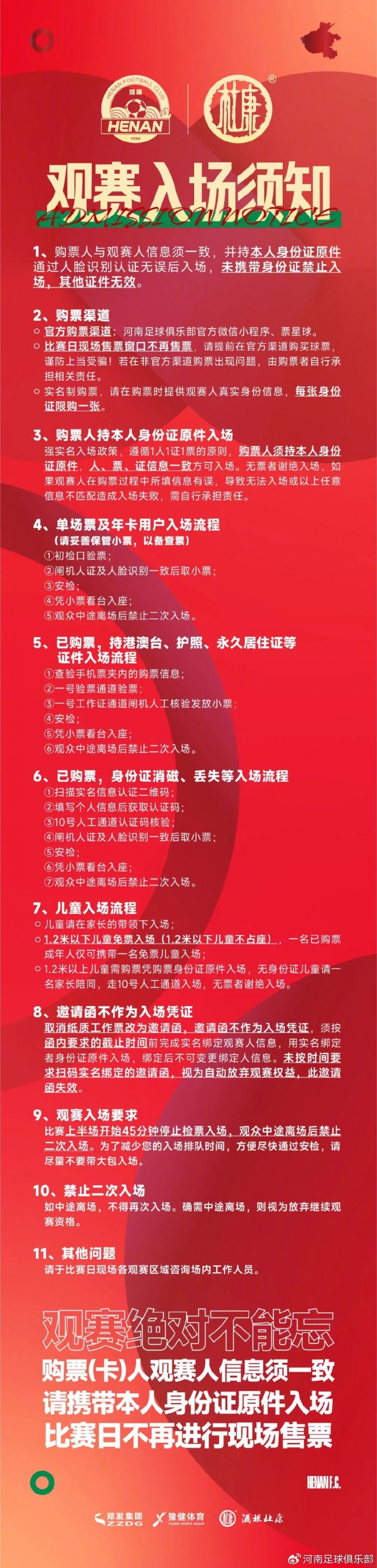 1、應河南賽區公安及反恐部門要求,球迷未攜帶身份證禁止入場,其他證件無效。