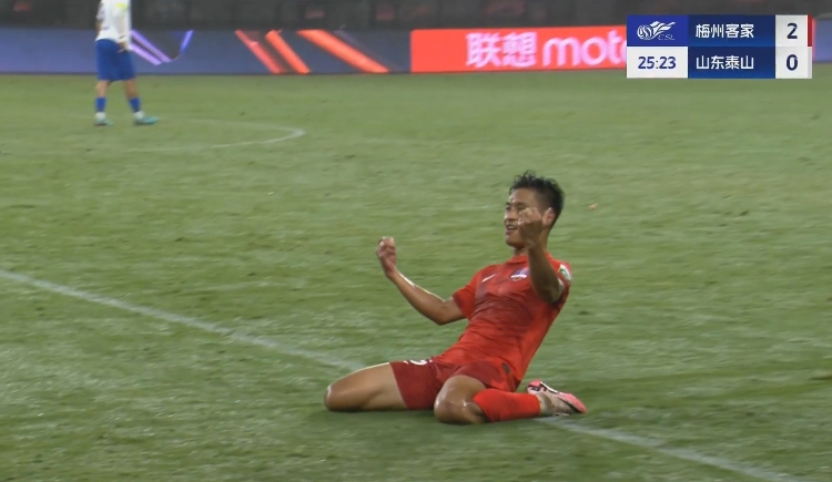泰山20分鐘0-2落后梅州!楊超聲倒鉤破門(mén)&2場(chǎng)3球狂奔半場(chǎng)滑跪慶祝