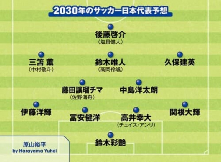 3月30日訊 據日媒Sportiva報道,近日該媒體開設專欄,開始對2030年世界杯日本隊首發陣容預測,有部分日本國內的自由撰稿人投稿對首發進行預測。以上撰稿人預測的陣容中,基本都是本期日本國家隊陣中的年輕球員,并結合部分現役U22國家隊、U20國家隊球員等組合而成。