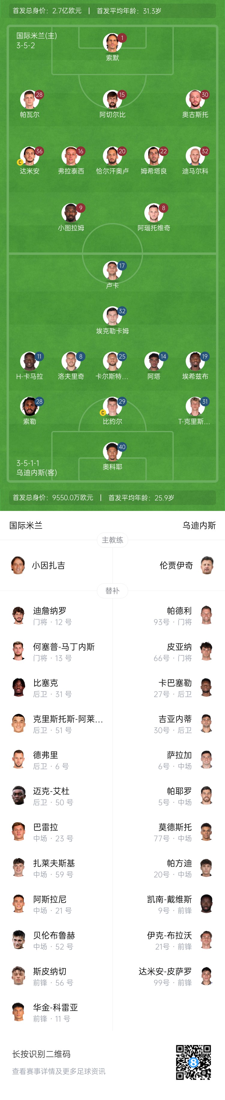國(guó)際米蘭首發(fā):1-索默、28-帕瓦爾、15-阿切爾比、30-奧古斯托、36-達(dá)米安、16-弗拉泰西、20-恰爾汗奧盧、22-姆希塔良、32-迪馬爾科、9-小圖拉姆、8-阿瑙托維奇