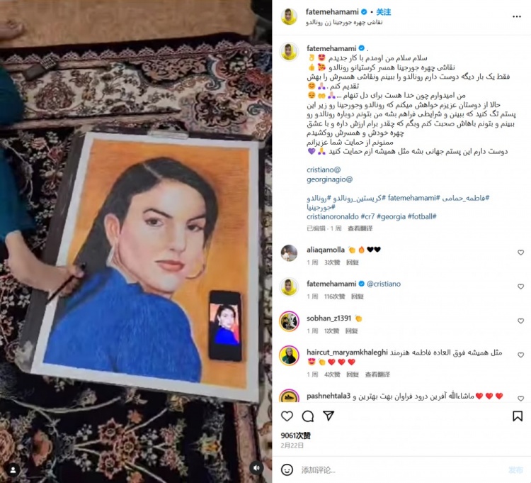 外媒:伊朗一畫家希望向C羅贈(zèng)送禮物,她為喬治娜準(zhǔn)備了畫作?