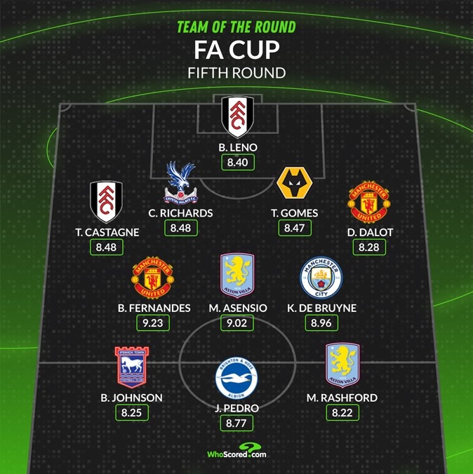 3月4日訊 足總杯十六強戰已經完賽,whoscored也統計了本輪足總杯評分最佳陣容,富勒姆、維拉和曼聯各2人入圍。