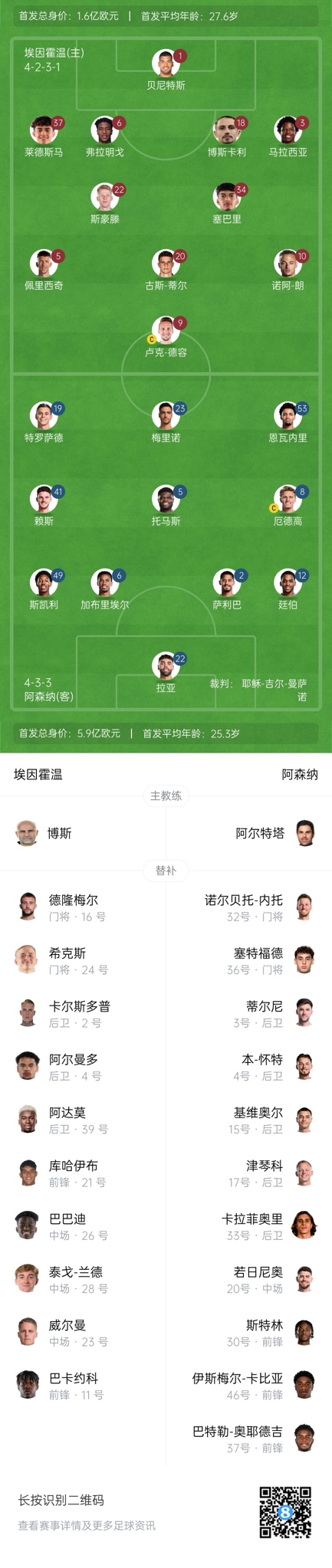 3月5日訊 歐冠1/8決賽首回合,埃因霍溫主場迎戰阿森納,賽前首發名單公布。