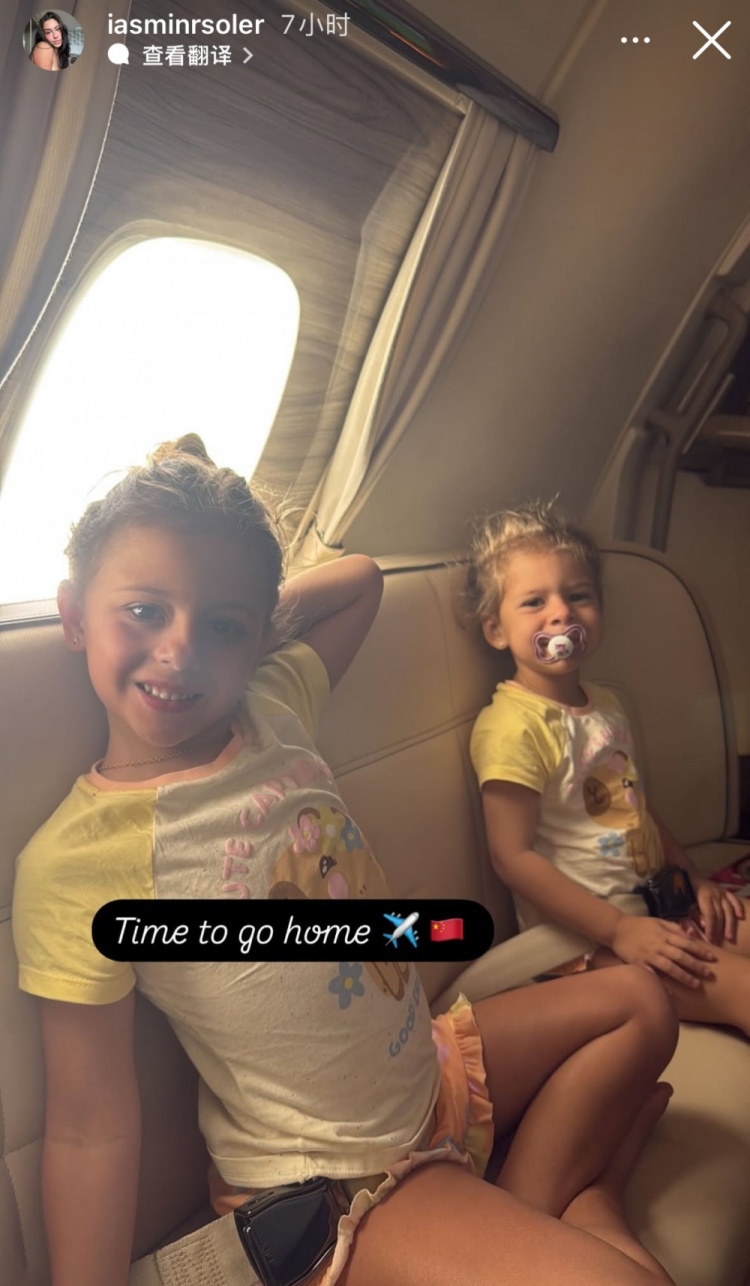 塞爾吉尼奧的妻子在社媒曬出了兩個孩子在機艙中的照片,她為此配文“是時候回家了”,并附上了“飛往中國”的表情。