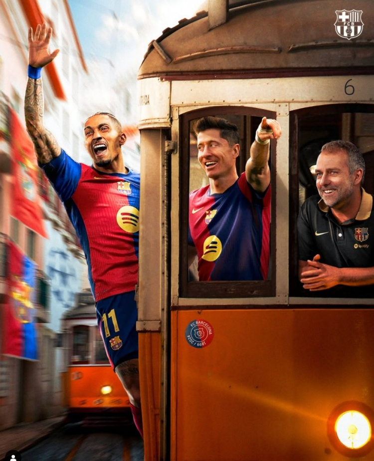 海報中弗里克、萊萬以及拉菲尼亞坐在前往里斯本的列車上,球隊官方社媒也配文寫道:“我們重回里斯本!”