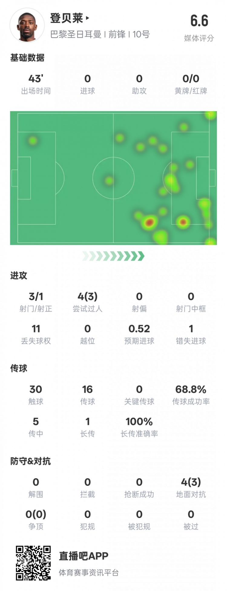 登貝萊半場數(shù)據(jù):3過人成功11次丟失球權&錯失1進球機會,評分6.6?