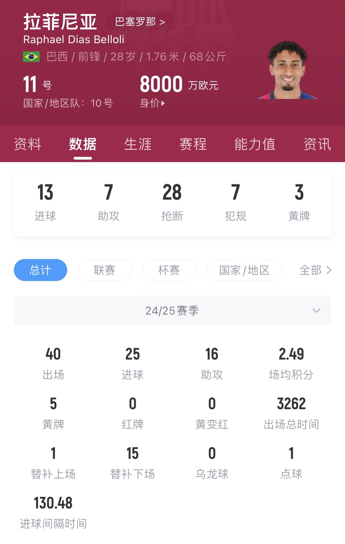 實打實的8000萬!拉菲尼亞25球16助,金球獎賠率第3高于維尼修斯?
