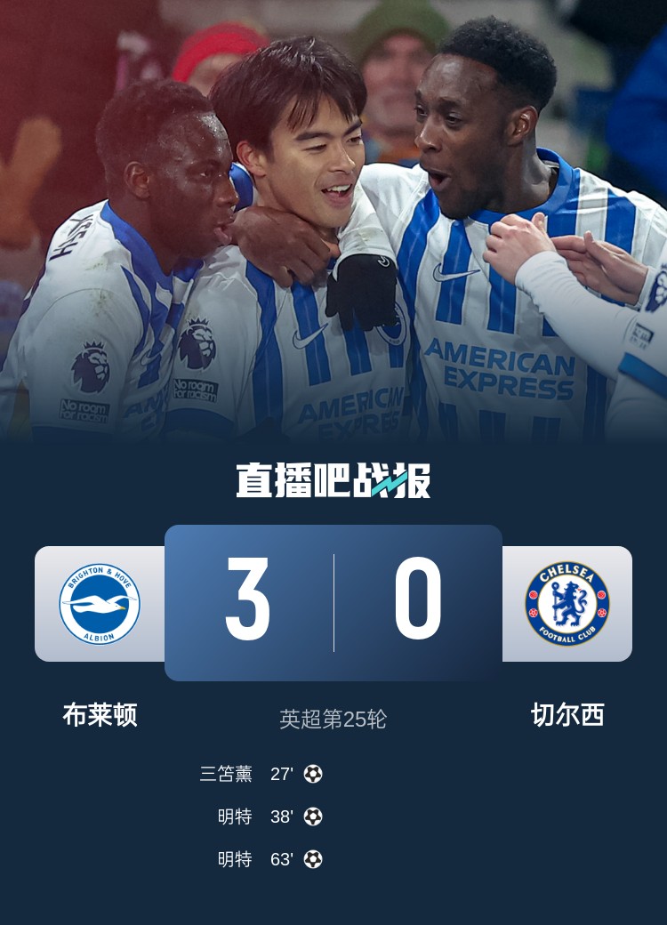 英超第25輪,切爾西客場0-3布萊頓。上半場,三笘薰完美停球兜射破門,明特再下一城;下半場,明特再入一球完成雙響。