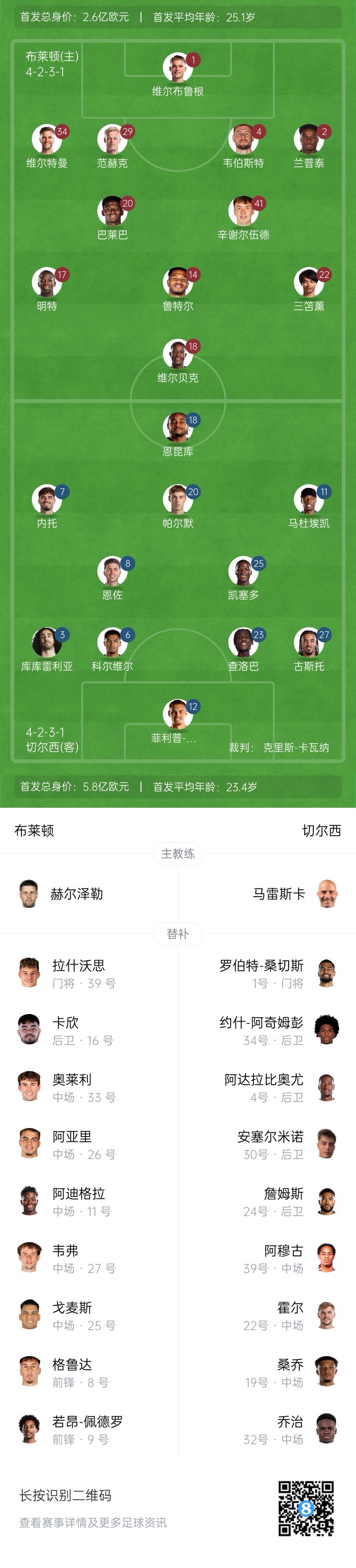 布萊頓替補:39-拉什沃斯、16-卡欣、33-奧萊利、26-阿亞里、11-阿迪格拉、27-韋弗、25-迭戈-戈麥斯、8-格魯達、9-若昂-佩德羅