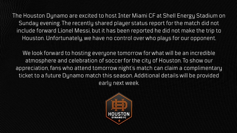 休斯頓迪納摩俱樂部很高興能在周日晚上在主場迎戰邁阿密國際俱樂部。最近的比賽球員狀態報告中沒有梅西,據報道稱他沒有前往休斯頓。
