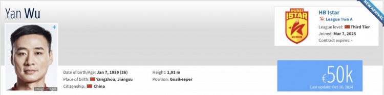 3月7日訊 根據德國轉會市場網站信息顯示,36歲的門將吳龑已經復出加盟了中乙湖北青年星。