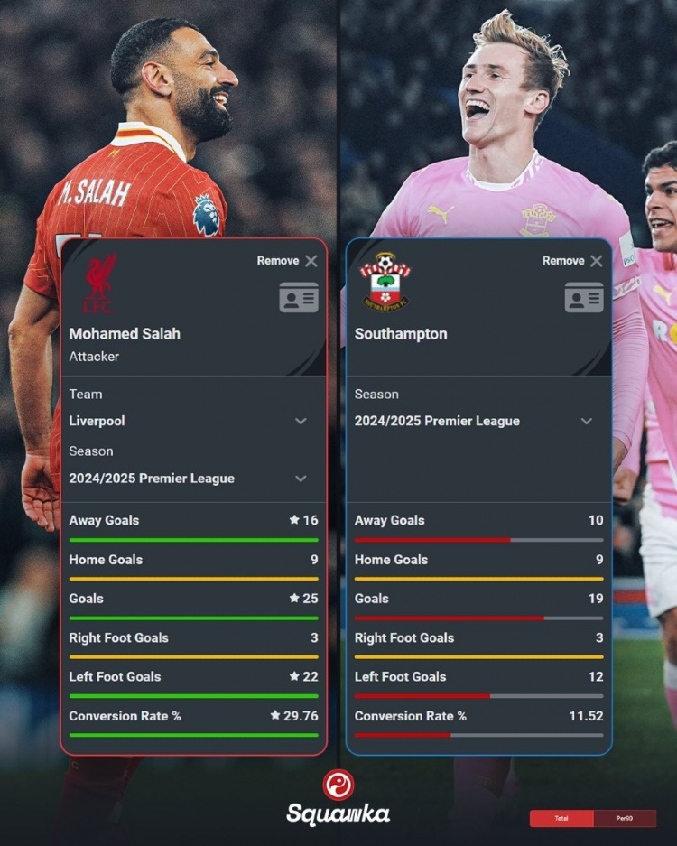 薩拉赫本賽季英超25球&轉化率29.76%,南安普頓同期19球&11.52%?