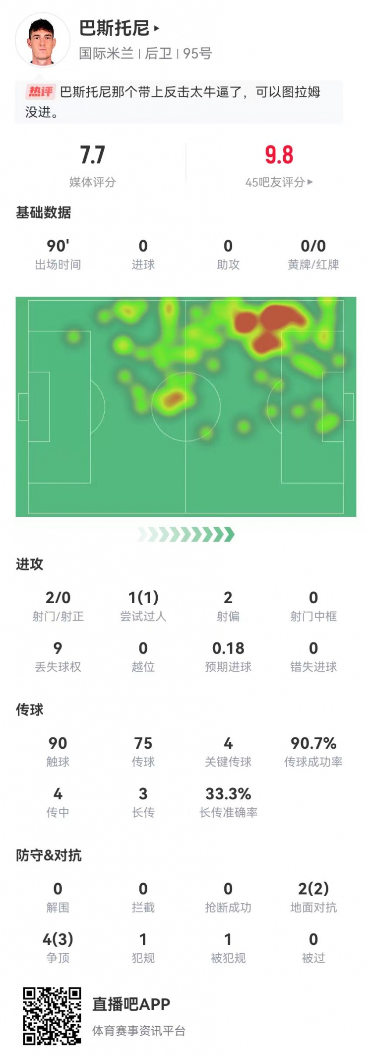 3月9日訊 國米在本輪意甲3-2逆轉蒙扎,巴斯托尼本場數據如下: