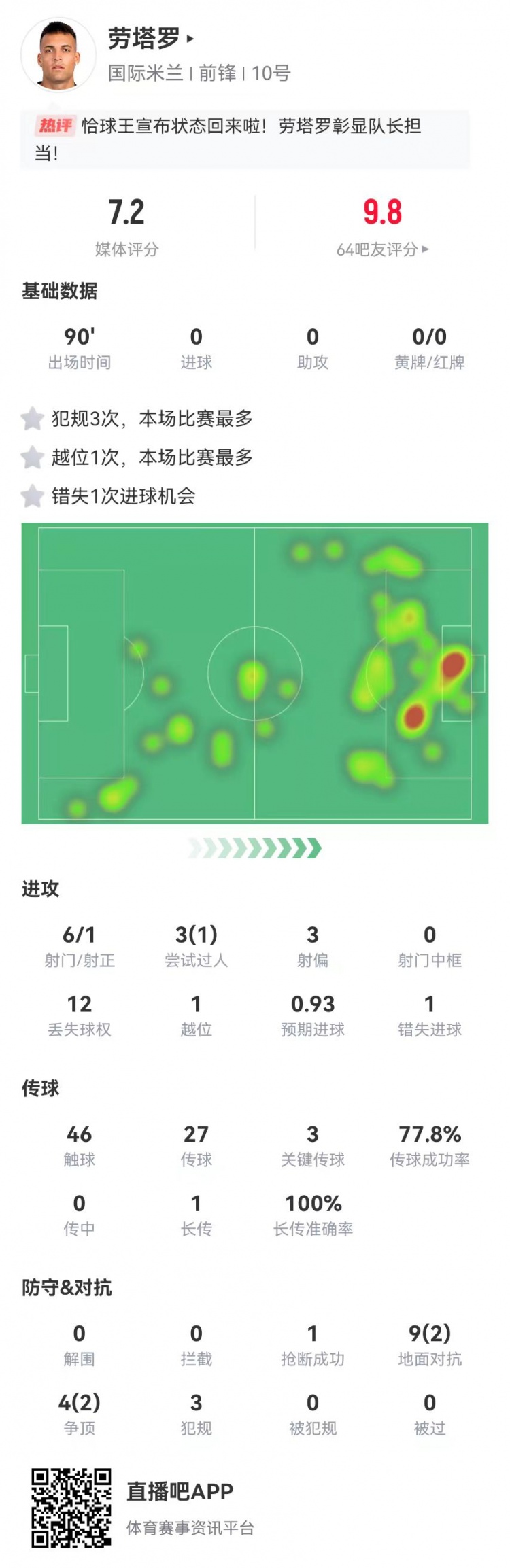 勞塔羅本場數據:6射1正+1失良機 3關鍵傳球+3犯規 13對抗4成功?