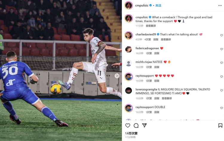 普利西奇社媒曬進(jìn)球照:多棒的逆轉(zhuǎn)!感謝球迷們始終不渝的支持?