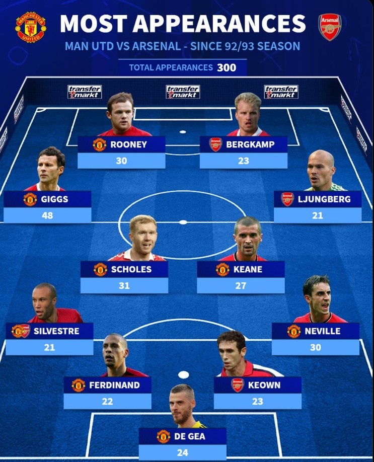 英超時代出戰阿森納VS曼聯次數最多陣:魯尼&吉格斯&博格坎普在列?