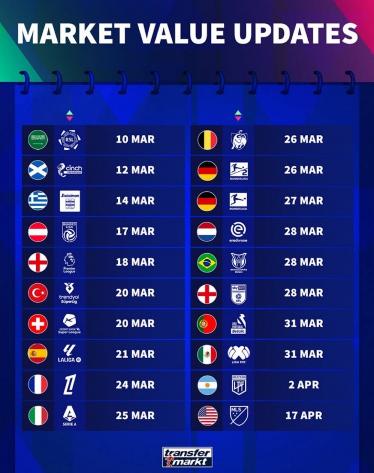 3月9日訊 德轉公布3-4月各聯賽球員身價更新時間,具體情況如下:
