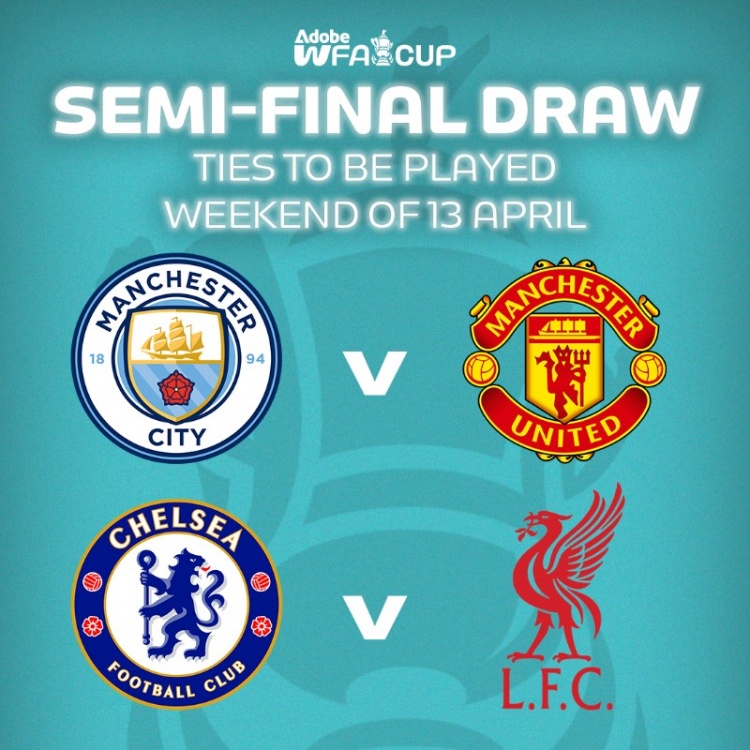 經過抽簽,女足足總杯半決賽對陣為曼城vs曼聯(lián)、切爾西vs利物浦,比賽將于4月13日的那個周末進行。