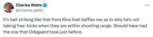 在賴斯進(jìn)球后,阿森納系的記者Charles Watts在社媒表示:“賴斯這樣的射門讓我困惑了,為什么獲得射程范圍以內(nèi)的任意球時(shí)不讓他去主罰呢?之前厄德高主罰的那個(gè)任意球應(yīng)該讓他去踢。”