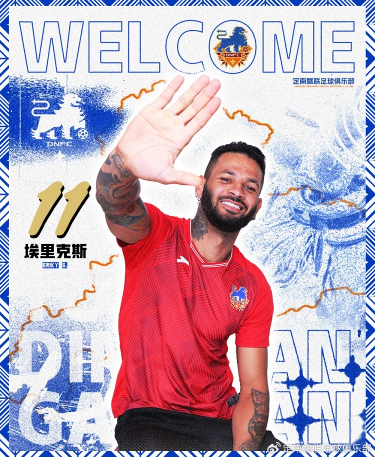 埃里克斯(Erikys da Silva Ferreira)1995年5月15日出生,身體素質好,技術全面,是一名靈巧的巴西籍職業球員,熟悉亞洲聯賽、中甲聯賽,2023賽季曾效力黑龍江冰城,單賽季攻入14球,入選中甲最佳陣容。2024賽季上半賽季效力于韓國天安城,下半賽季回歸中甲聯賽效力于石家莊功夫,2025賽季埃里克斯轉會定南贛聯,將身穿11號球衣為定南贛聯效力。