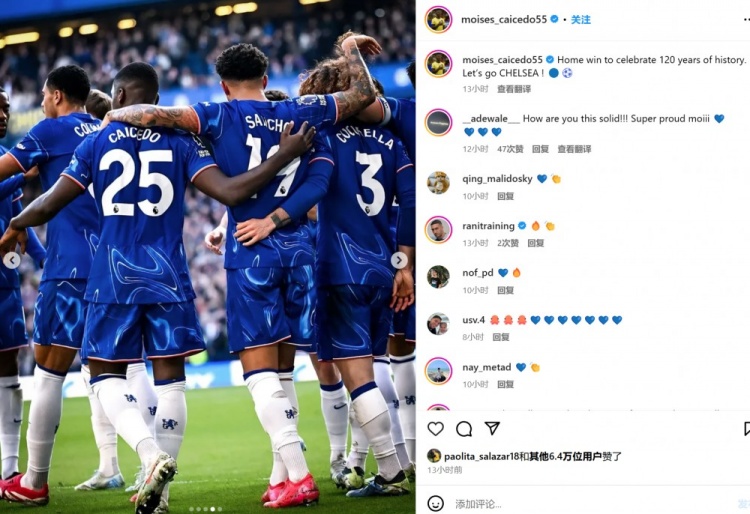 他也在賽后通過社媒曬出和隊友們的慶祝照,并配文:“以主場勝利為俱樂部120周年慶生!切爾西加油!????