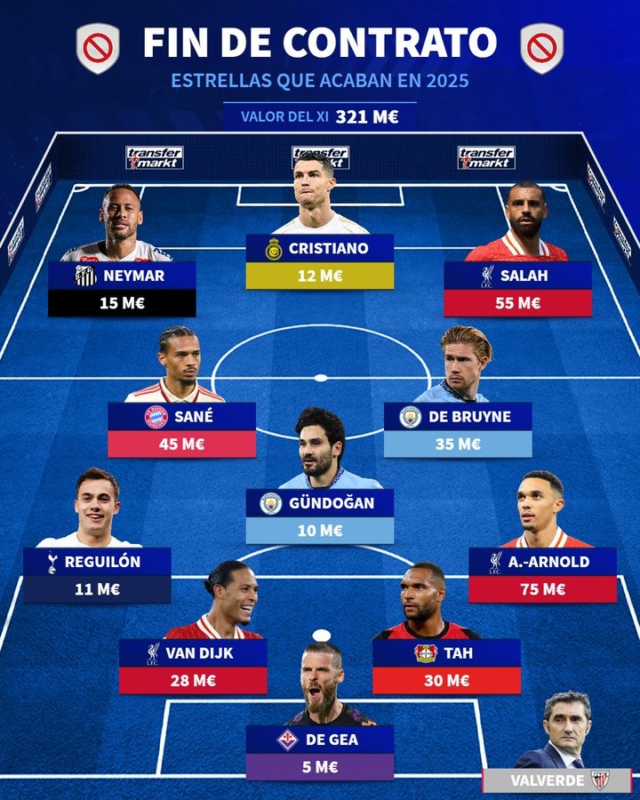 前鋒:內(nèi)馬爾(桑托斯,1500萬(wàn)歐)、C羅(利雅得勝利,1200萬(wàn)歐)、薩拉赫(利物浦,5500萬(wàn)歐)