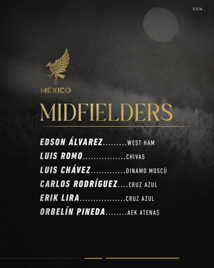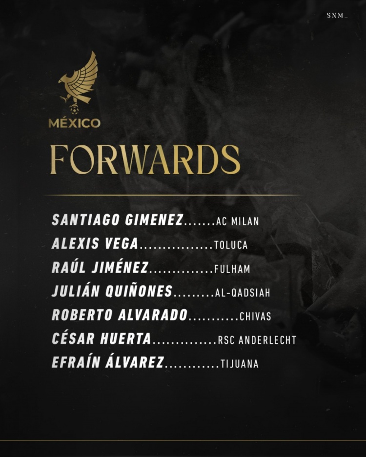 前鋒:圣地亞哥-希門尼斯(米蘭)、貝加(托盧卡)、勞爾-希門尼斯(富勒姆)、奎尼奧內斯(卡迪西亞)、阿爾瓦拉多(瓜達拉哈拉)、韋爾塔(安德萊赫特)、埃弗林-阿爾瓦雷斯(蒂華納)