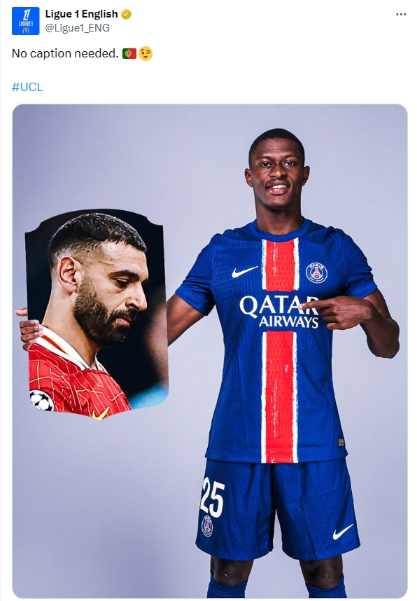 比賽結(jié)束后,法甲英語(yǔ)官推曬出努諾-門德斯手持薩拉赫卡片的P圖,并配文:“無(wú)需多言”。