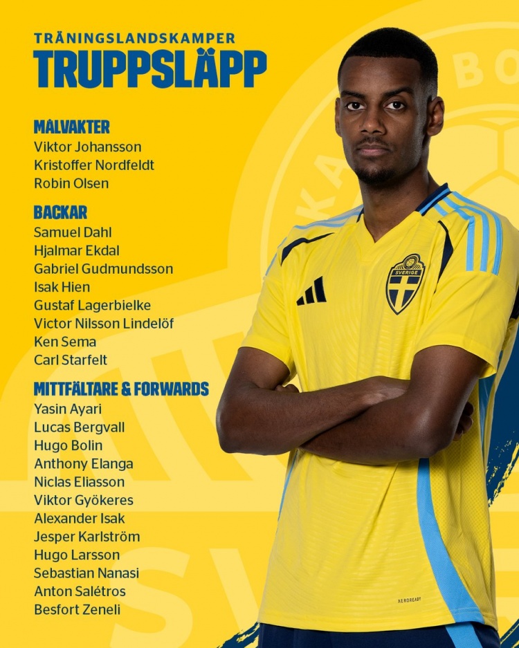 中前場:阿亞里(布萊頓)、貝里瓦爾(熱刺)、博林(馬爾默)、伊蘭加(諾丁漢森林)、埃利亞松(雅典AEK)、約克雷斯(葡萄牙體育)、伊薩克(紐卡)、卡爾斯特羅姆(烏迪內斯)、雨果-拉爾森(法蘭克福)、納納西(斯特拉斯堡)、薩萊特羅斯(AIK索爾納)、澤內利(埃爾夫斯堡)
