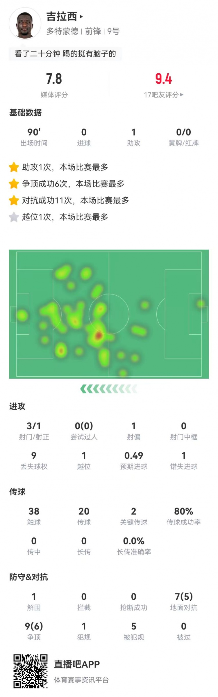 吉拉西本場1造點1助攻2關鍵傳球 16對抗11成功+5造犯規 獲評7.8分?