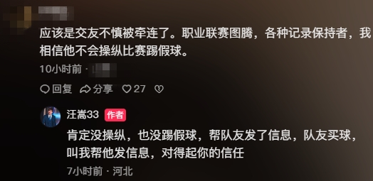 網友:應該是交友不慎被牽連了。職業聯賽圖騰,各種記錄保持者,我相信他不會操縱比賽踢假球。