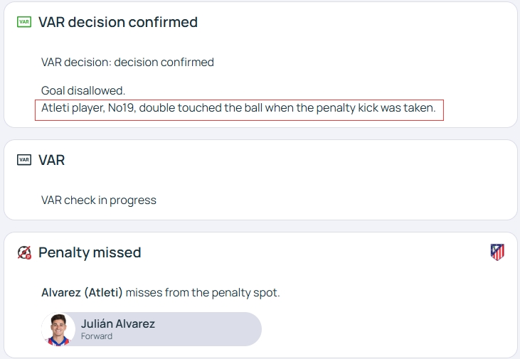歐冠官網對此的解釋為:VAR判決確定,進球無效。馬競19號球員(阿爾瓦雷斯),罰點時兩次觸球。